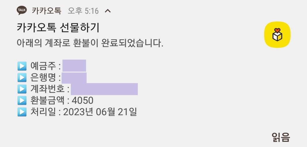 카톡 선물 환불 완료. 계좌로 입금된 90% 환불금액